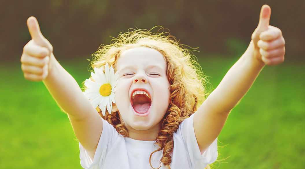 Laughing girl with daisy in her hairs, showing thumbs up.