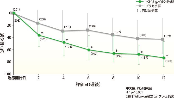 比較対象の目的で偽薬を外用した方のグレー色のデータです。