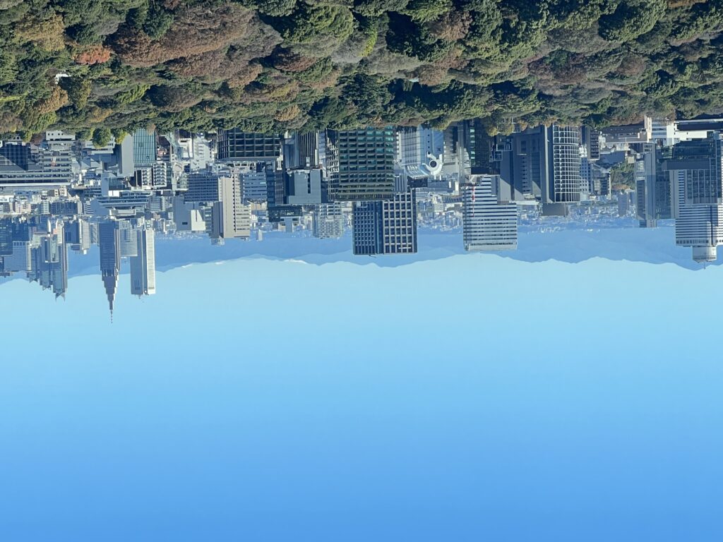 朝目覚めると、青空と紅葉と