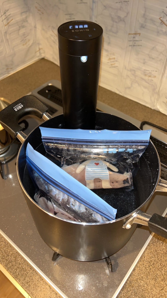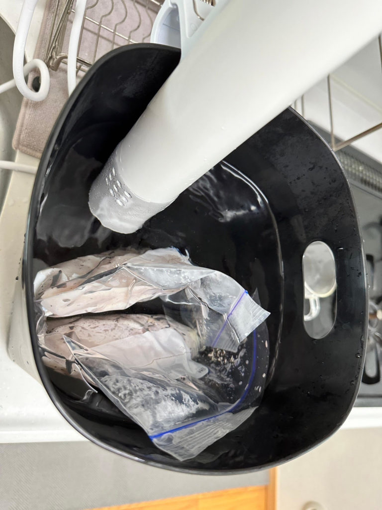 あとは食材を入れたフリーザーバッグの空気を抜いてお湯で沈めるだけ