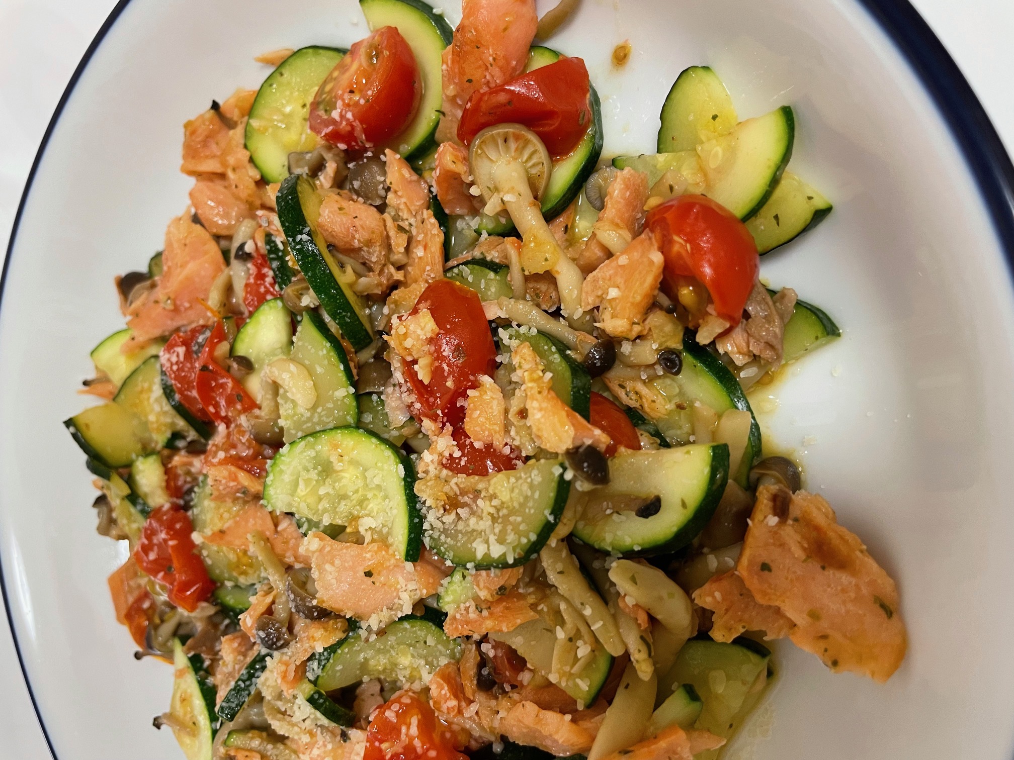 ガーリック、ズッキーニ、トマト、しめじ、鮭、粉チーズ、マジックソルトなど…