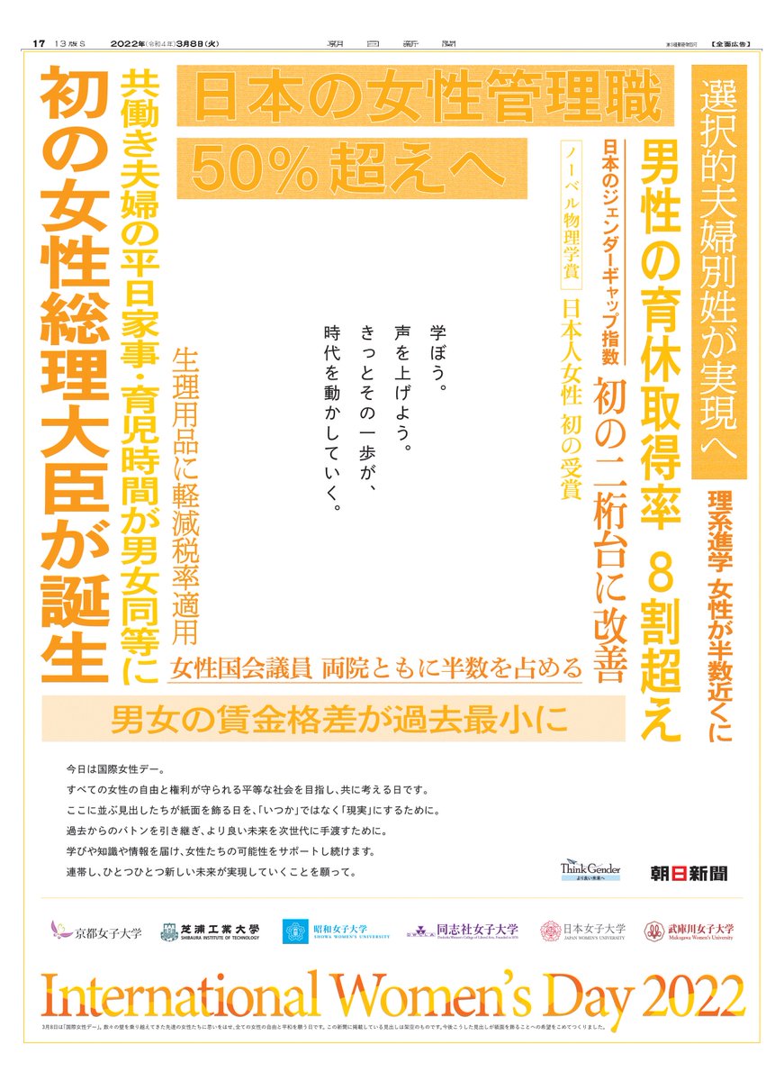 朝日新聞には国際女性の日に合わせて素敵な記事(フェイク新聞)がでてました✨