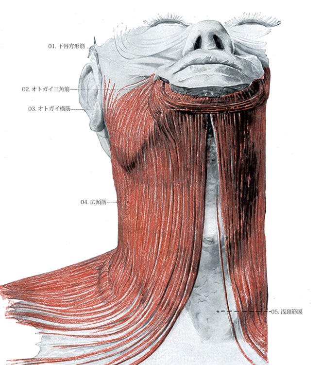 顔首で最大の筋肉で、顔を「下に引っ張る」作用があります。