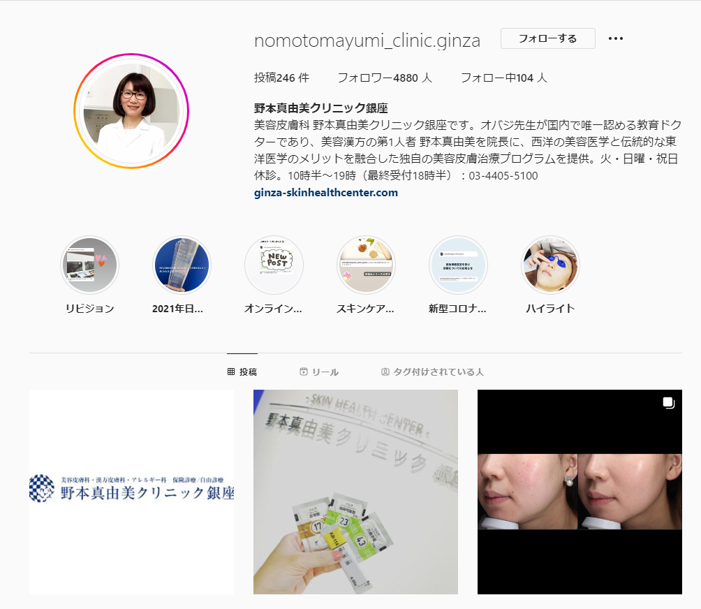 治療やお化粧品はもちろん、野本医師のプライベートやファッションなども掲載しています。