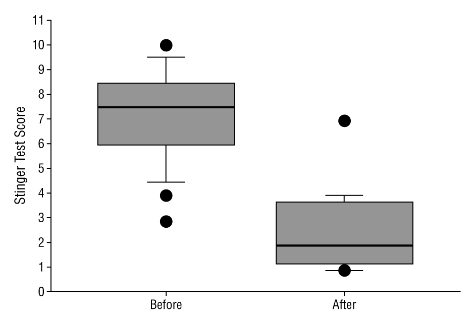 24人はレーザー治療後にスティンガーテストが陰性、7人の患者は刺激症状が減りました。