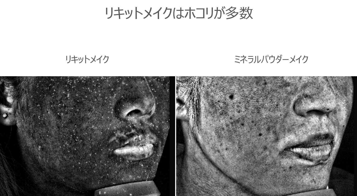 左側のリキッドメイクには多数のほこり(白いドット状)が付着しています。